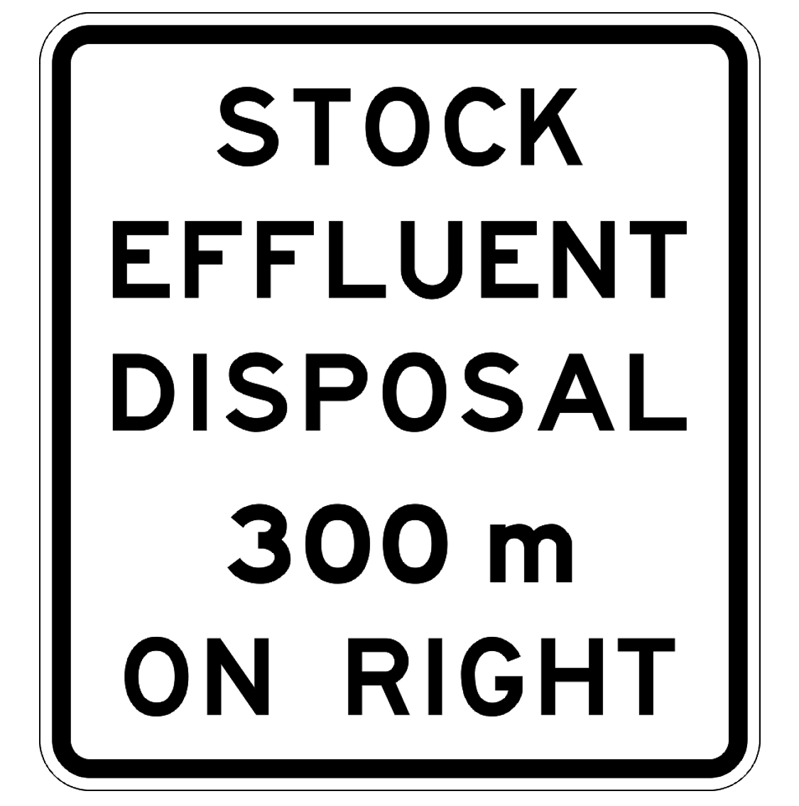 Stock Effluent Disposal _00m On Left - This sign should be used to advise drivers of stock transporters of the presence of these facilities.